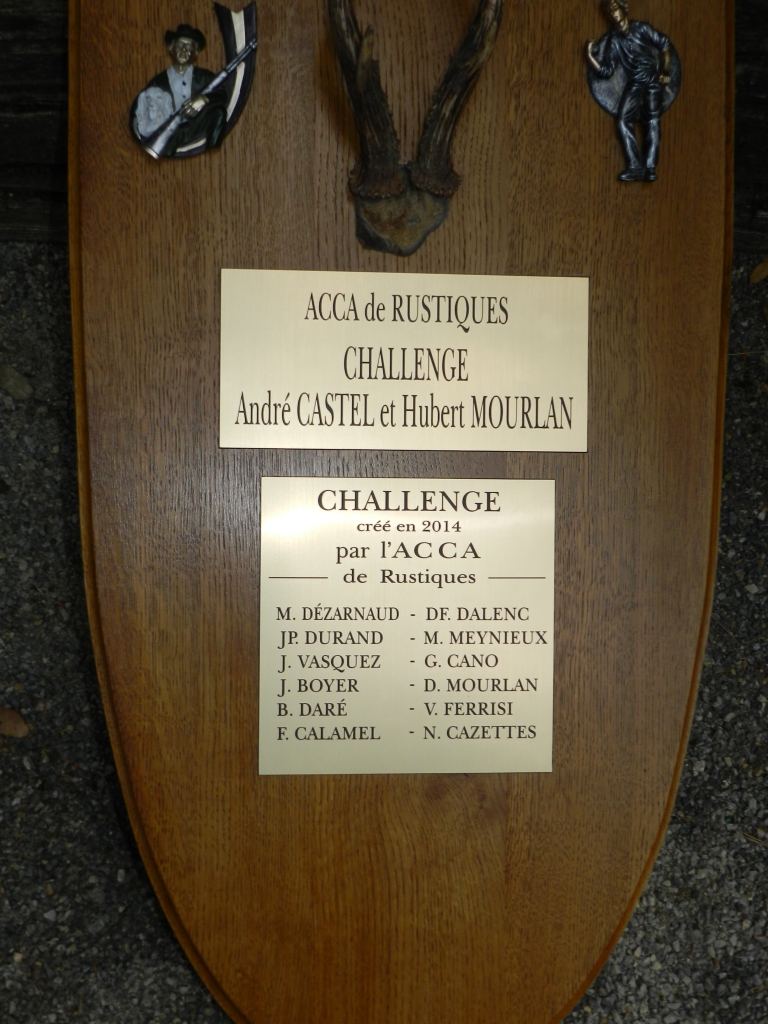 Le président Marc Dézarnaud entouré de son bureau profitait de ce moment pour présenter un magnifique trophée (fabriqué par le menuisier du village Jean-Paul Durand), qui sera remis chaque année au vainqueur du concours de pétanque, organisé par l'association. Ce trophée rend hommage à deux personnes disparues aujourd'hui, qui étaient très estimées dans le village et qui ont joué un rôle prépondérant à la société de chasse : André Castel en tant que président et Hubert Mourlan en tant que trésorier.